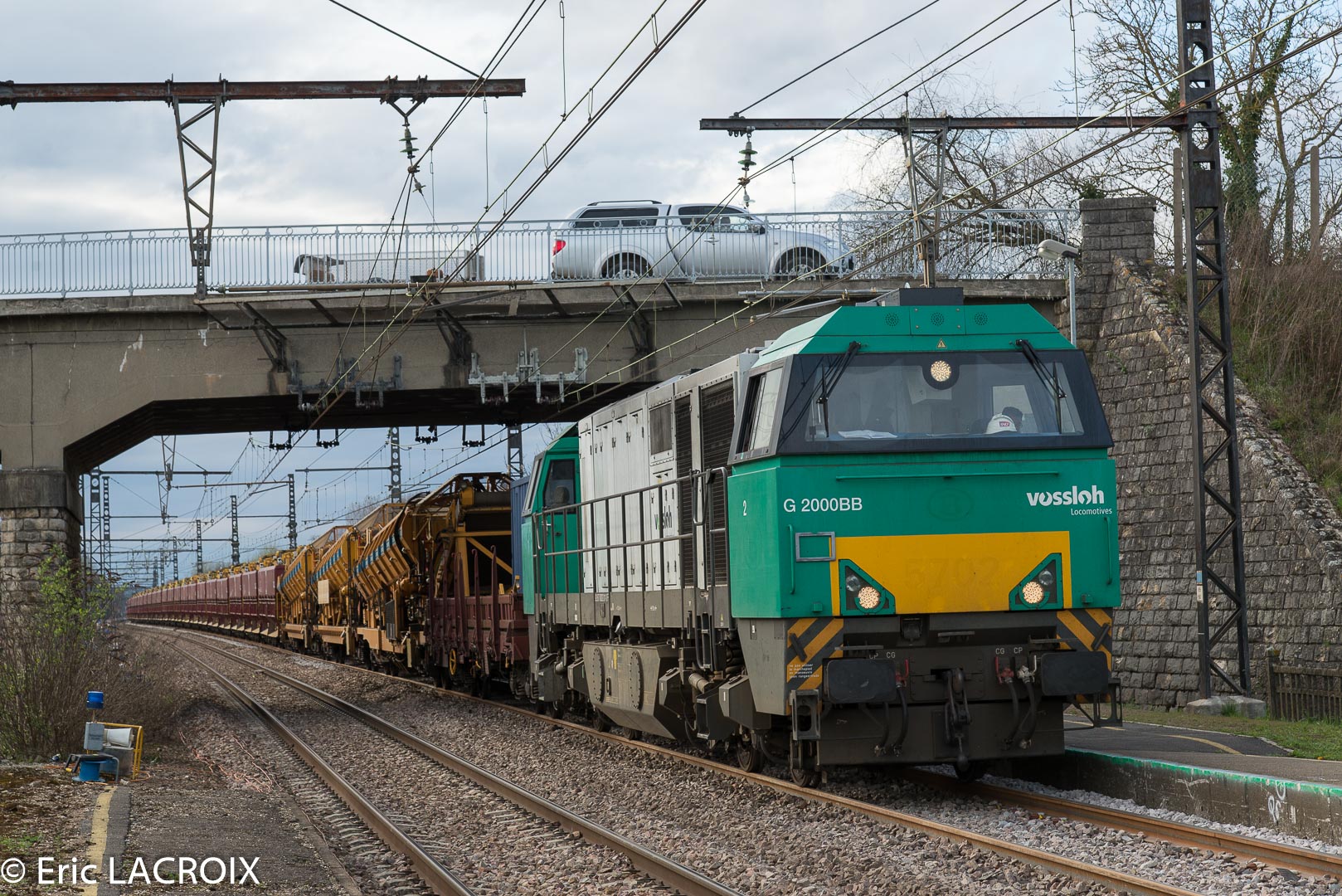 G 2000 BB 5001603 - 92 87 0 002 011-0 F - ETMF en tête du train de dégarnissage Matisa C-75 - 99 87 9 314 507-4 GCF Roma sur le RVB voie 1 bis à Villeneuve la Guyard (89) en mars 2017.