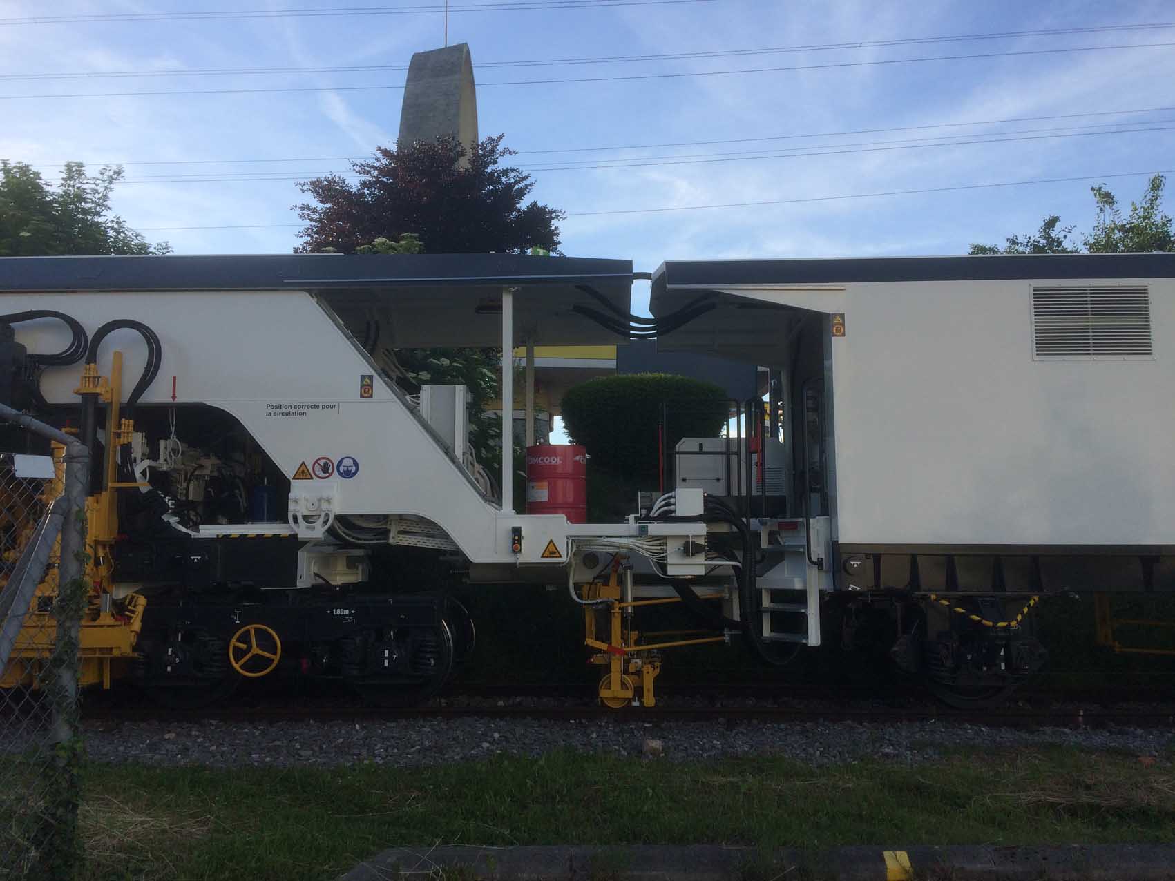 Cette bourreuse est équipée d'une stabilisation partielle dynamique de la voie, dans le cadre des restitutions de voies aux circulations commerciales à 80 km/h.