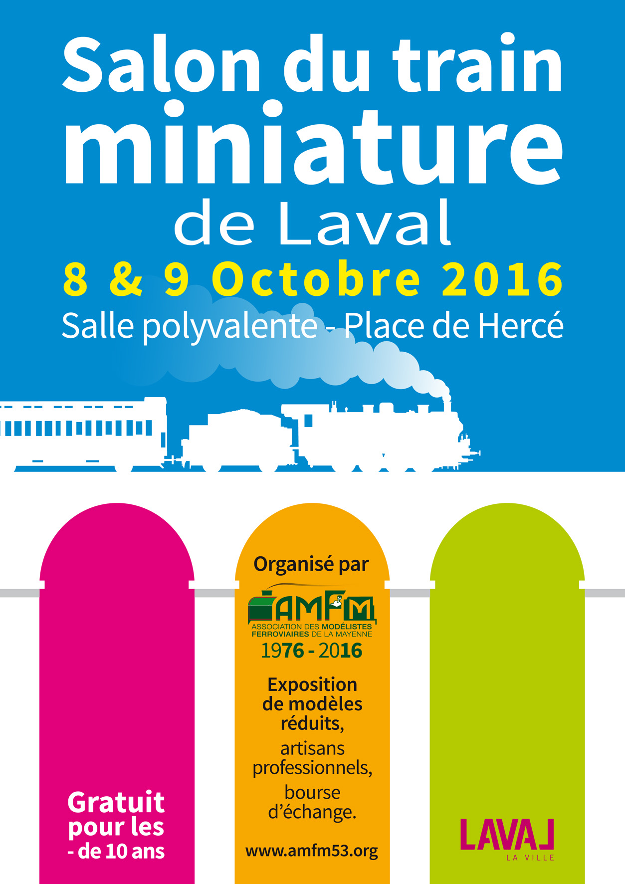 La troisième édition du Salon du Train Miniature de Laval se tiendra les 8 et 9 octobre 2016 dans la salle polyvalente (2500 m²) de Laval (Dépt.53). A l'occasion des 40 ans de l'AMFM (Association des Modélistes Ferroviaires de la Mayenne), nous vous proposerons un riche plateau de réseaux (clubs et particuliers) ainsi que des professionnels (artisans et vendeurs) de notre loisir.