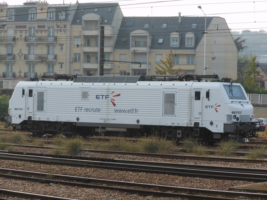 Vue à Juvisy de la 37037 d'Akiem aux couleurs d'ETF.