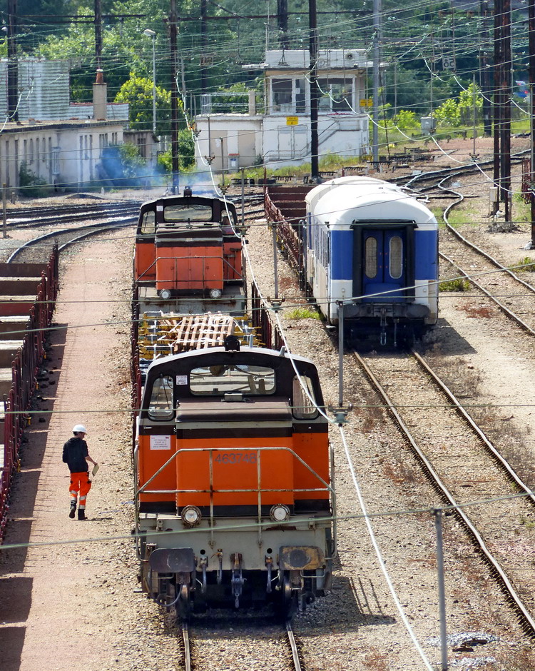 La voici dans le dépôt de Saint Pierre des Corps le 21-06-2015 entre la 667548 Infra et la 469246 Fret