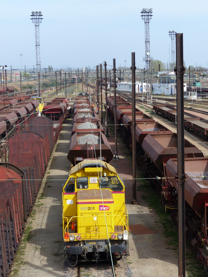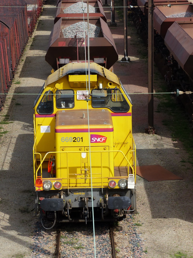 Voici la machine avec la 666061 et une rame de Trémies sur la zone de garage des rames Infra