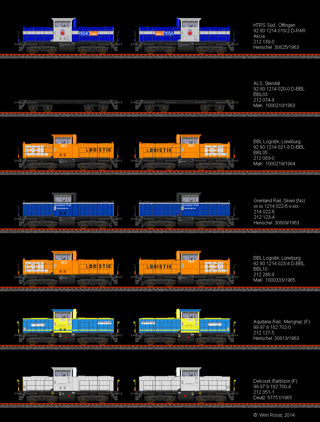 première la seule 211 transformé par Henschel et les 8 211 transformé par OnRail/MaK (Regiolok DH1004). Et après ça les 212 transformé de Alstom Stendal/Gmeinder Mossbach (214)