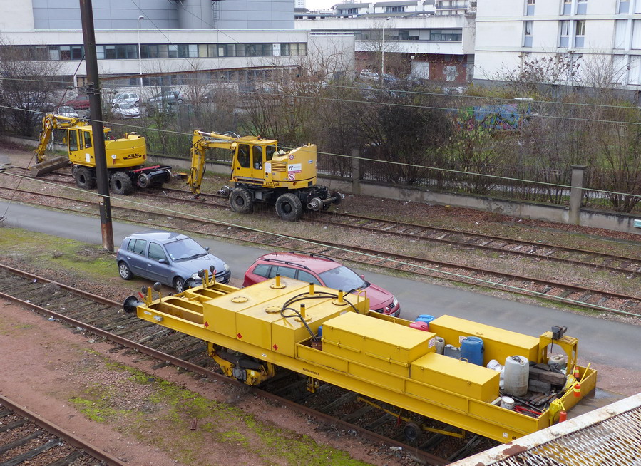 il y a une petite base de travaux Meccoli à Tours avec 4 pelleteuses Rail Route avec la Bourreuse