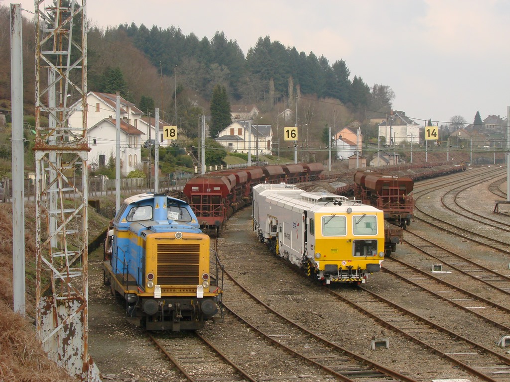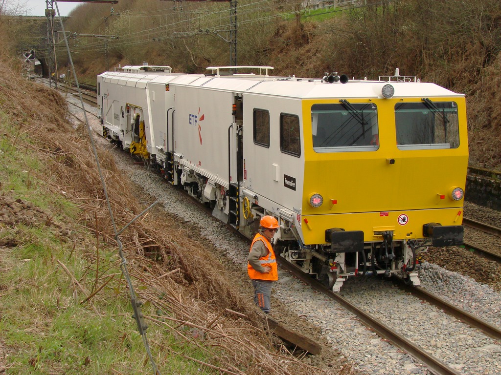 La machine en attente côté nord de la gare avant d'intervenir. Pendant ce temps, le ballastage d'un coupon de voie principale (V1) est en cours.