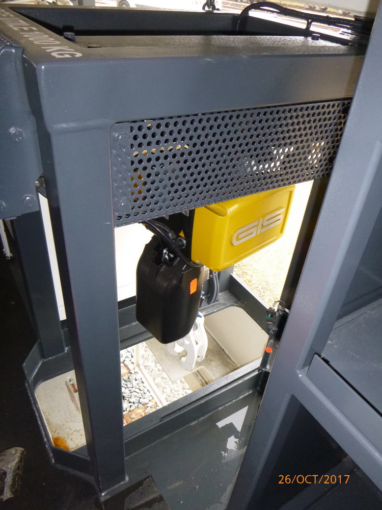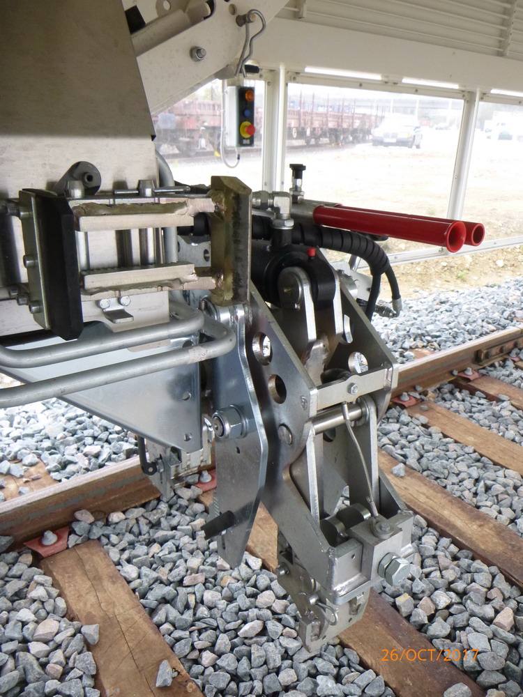 En dessous : la clipeuse, les supports des rails en position haute. La manche d'extraction de la fumée, il est très vitré sauf aux emplacement dédiés au travail: coupe soudure des rails