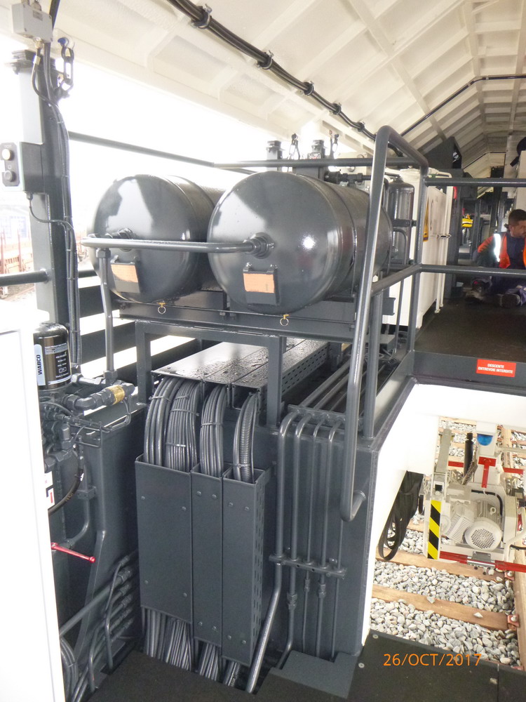 Nous pouvons voir les outils, l'énergie, les cabines, les sièges pour les ouvriers, l'extraction des gaz de soudure, le treuil pour manipuler les traverses et leurs points de stockage de part et autres du treuil. les trois treuils pour les coupons de rail (par fil de rail) six en tout.
