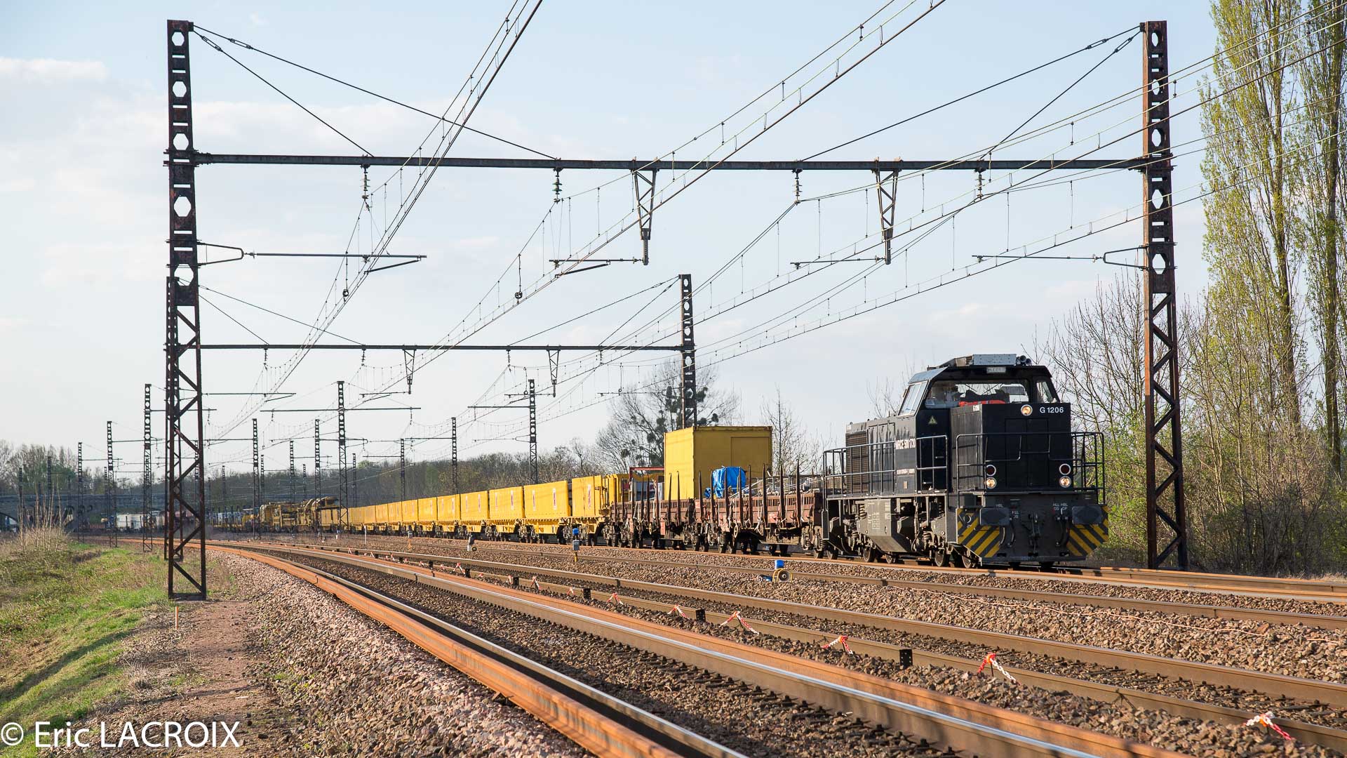 G1206 BB 5001730 - 92 80 1276 036-1 louée à ETMF en tête du train de renouvellement P95 MATISA Transalp Renouvellement passe à Villeperrot (89) pour rejoindre la base de travaux de St Florentin. Avril 2017.