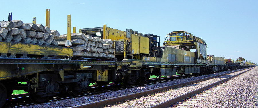 . wagon 5 WF - force avec poutre : évacuation du ballast, enlèvement des anciens rails et pose de nouveaux longs rails soudés