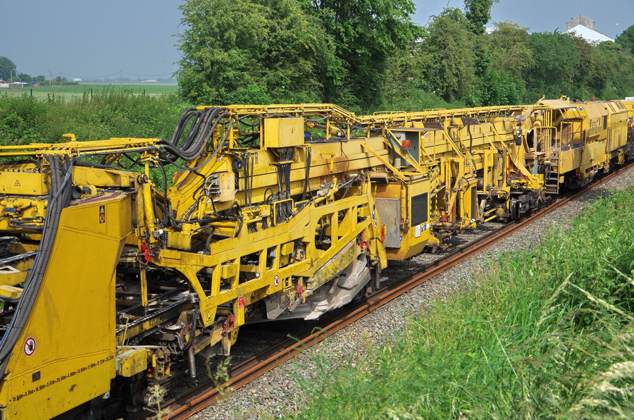 Train de pose P95 ETF 99 87 9 311 503-6 - ETF - "Addax avec le wagon 4 WM - de manutention et groupe de travail avec chaîne de dégarnissage, dépose et pose de traverses) PK 20 à Marcelcave le 04-06-2018
