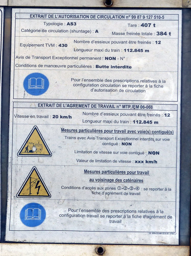 Agrément de travail MTP IEM 06 068 - 16-08-2016 / 16-08-2019 avec TVM 430 (Tare 407 t - longueur 112,845 m)