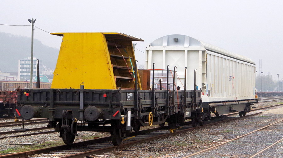 wagon couvert Habis 82 6 : 99 87 9 383 793-6 (wagon pour le transport du carburant et du gaz)wagon plat à essieux K50 : 99 87 9 383 686-6