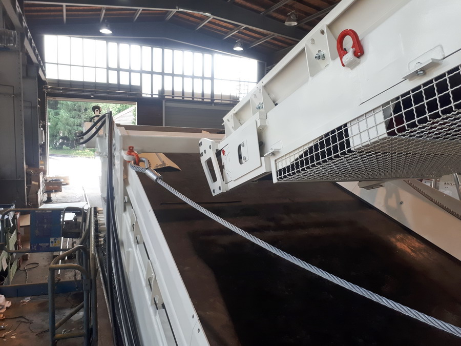 wagons pour convoyer, stocker et décharger jusqu’à 68 m³ de matériau, avec convoyeur de transfert orientable.