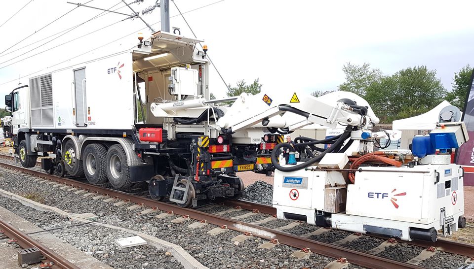 Camion Mercedes Actros converti par Zweiweg, il porte une tête Schlatter de soudure électrique des rails .