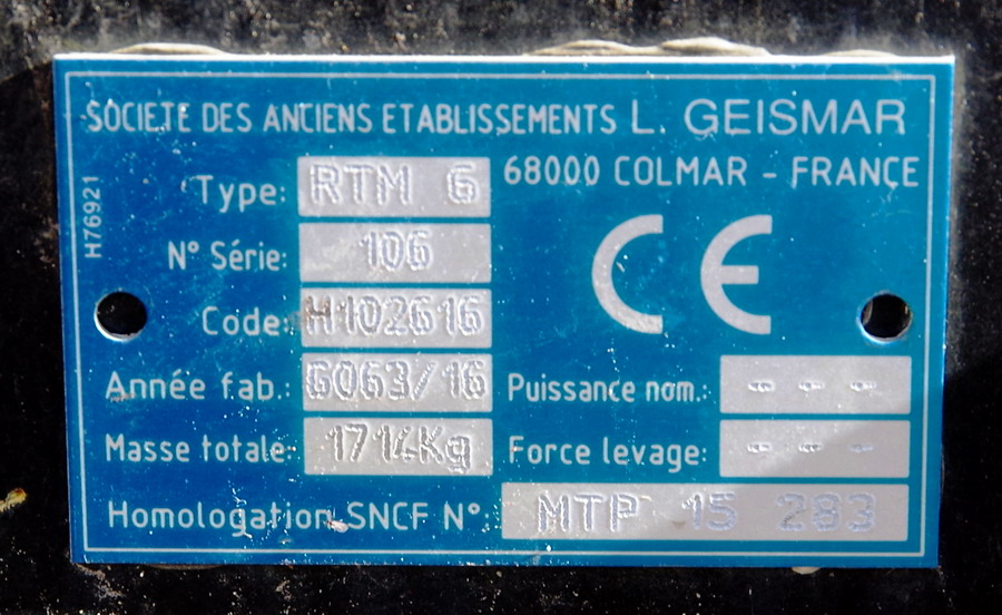 Homologation SNCF MTP 15283 - 08-12-2018 et d'une masse totale de 1714 Kg
