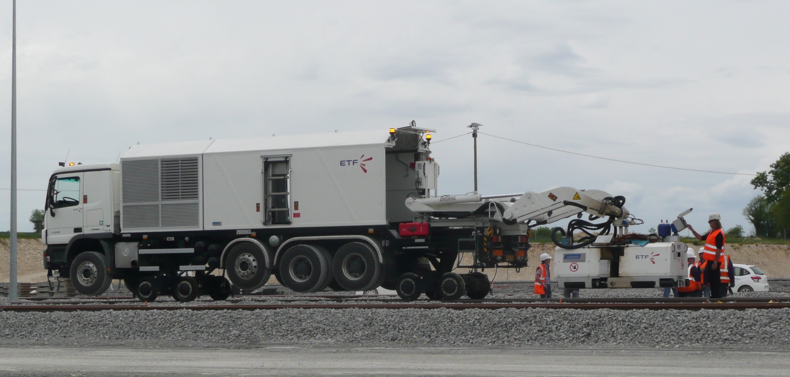 Camion Mercedes Actros converti par Zweiweg, il porte une tête Schlatter de soudure électrique des rails .