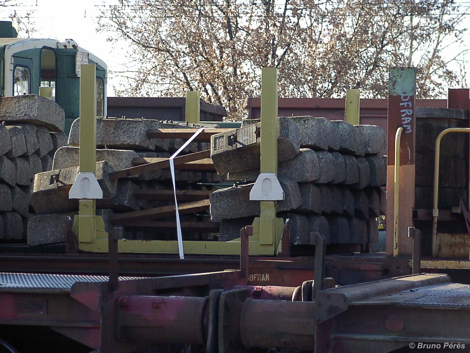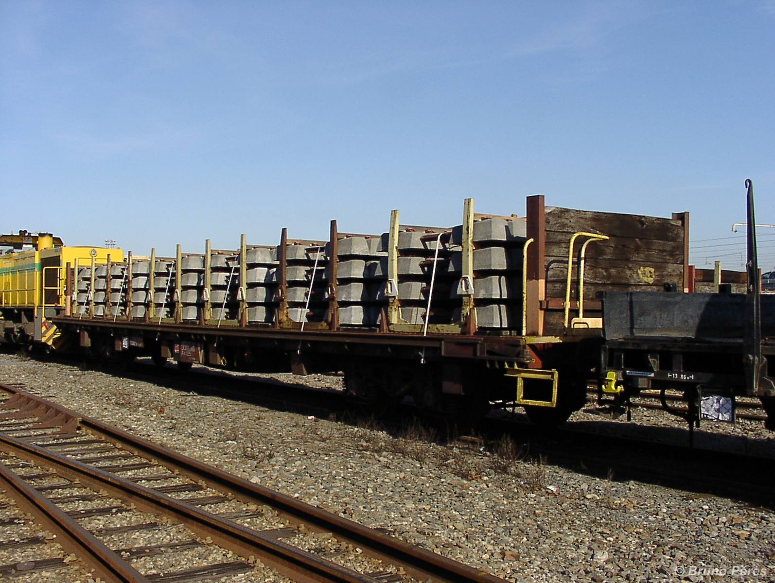 Voici quelques photos de plats chargés de traverses palettisées pour suites rapides. Ces palettes sont prises en charges sur chantier par des portiques circulant sur des rails fixés sur chaque flanc des wagons. Ces portiques alimentent le train de substitution SMD 80 (ETF ou Colas Rail), la TSV 21 GP (TSO et Colas Rail) ou le futur P95 d'ETF.