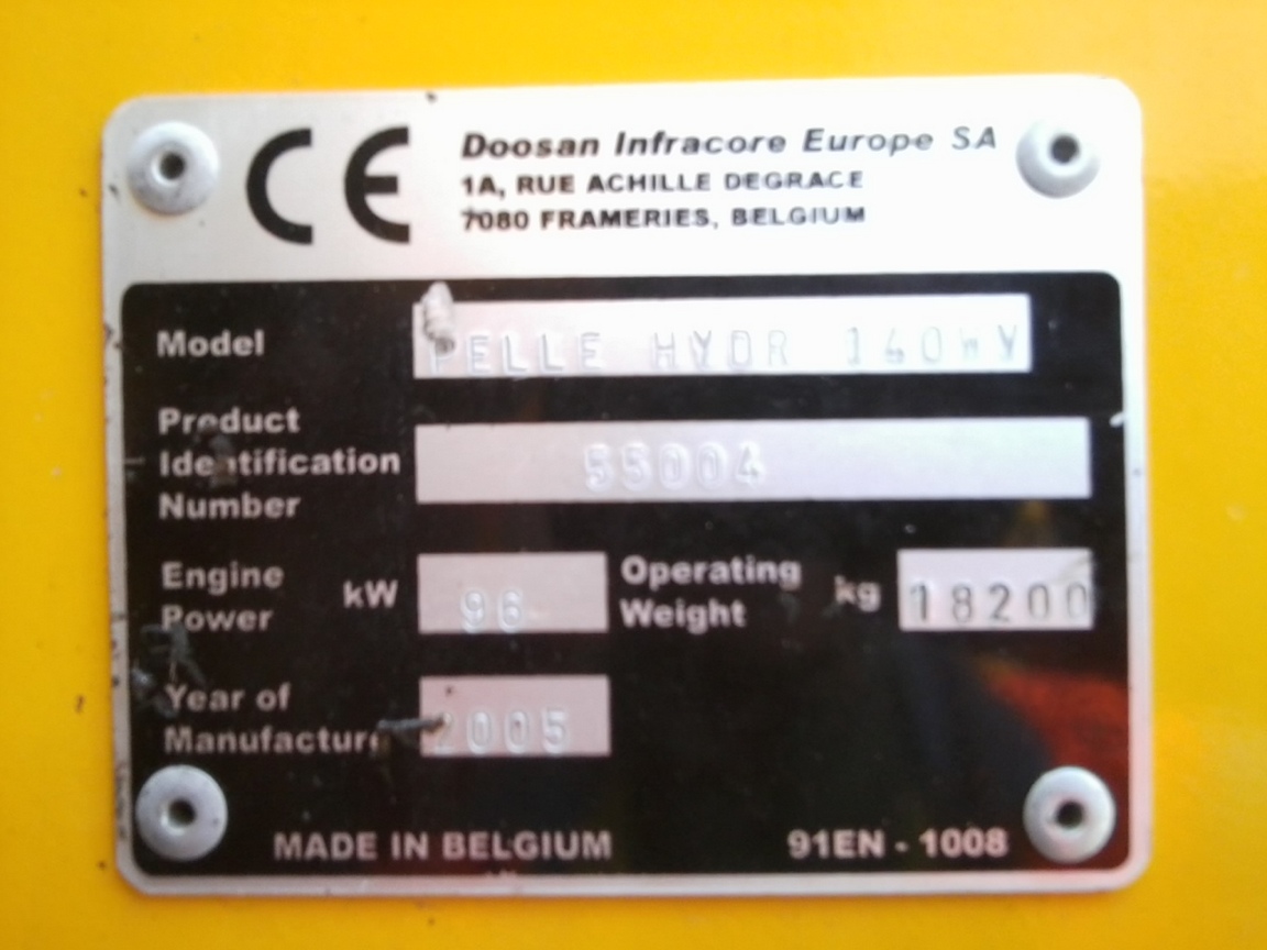 Je pense que tu peux rajouter à ta liste la plaque constructeur de cette pelle :mrgreen: car, sauf erreur de ma part, la plaque en photo n'est pas la bonne. Voici un plaque constructeur de Doosan (ici, une 140 WV-RW d'ESAF) :