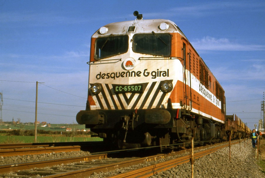 Voila la CC 65507 en livrée Desquenne & Giral vers 1989/1990 sur une rame de travaux entre Hazebrouck et Calais