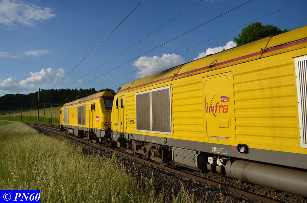 Bonjour Voici la machine (mise en service le 28-01-2009) avec une rame de wagons plats R39 et de la rame LRS ensemble n°23 sur la zone de garage des rames infra à Saint Pierre des Corps le jeudi 20-11-2014, train vide pour Moulin-Neuf