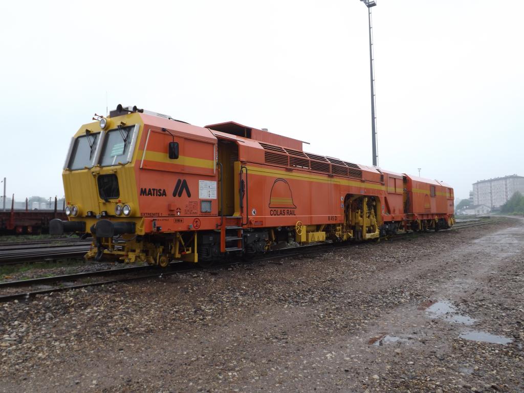 Passage à Danjoutin, aux abords de la zone de stockage des matériaux usés. La G1206 Jennifer est en attente avec une rame remplis de coupon de voie et de vieux ballast. Attends le déchargement.