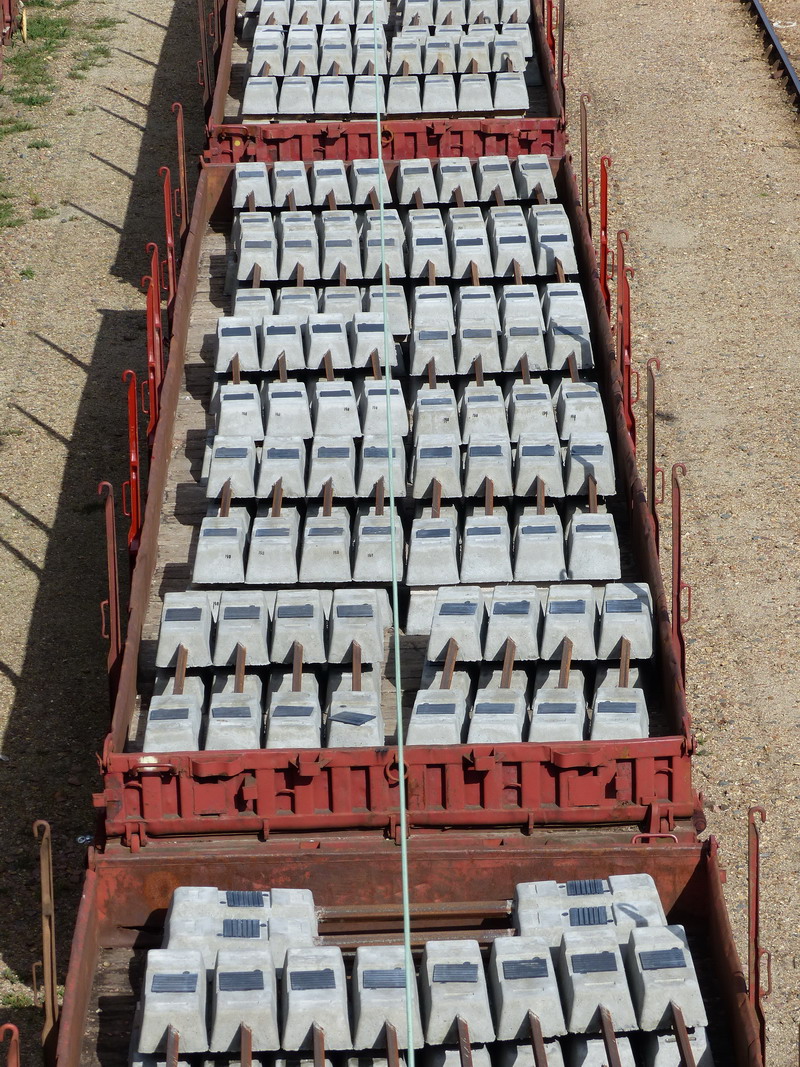 Voici un wagon plat à essieux 40 87 953 4 979-9 Us K39 1 SNCF-PSL avec un chargement de traverses sur une rame infra