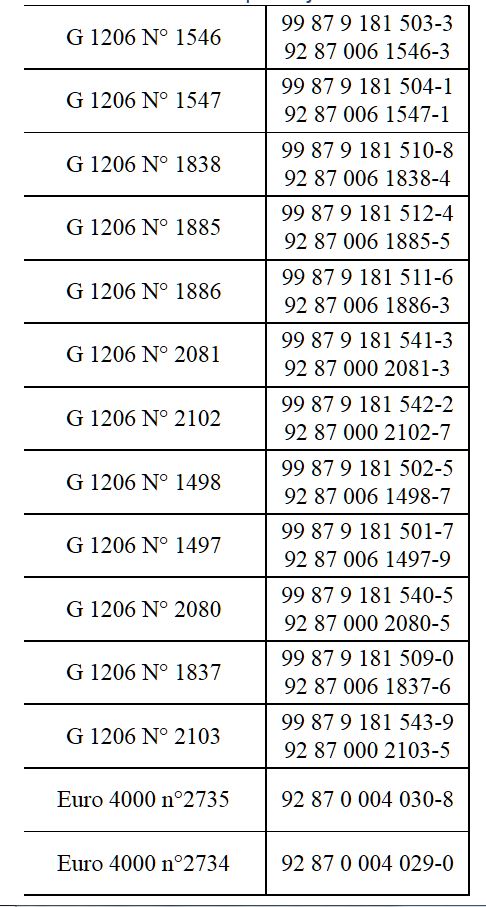 je vous mets la liste des changements d'EVN pour 11 G1206 et les 2 Euro 4000