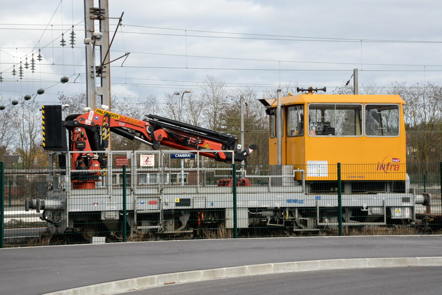 Le voici en gare de Cambrai (59) le 06 mars 2018 avec deux wagonnets 99 87 9 750 102-5 et 110-8 SNCF-LL