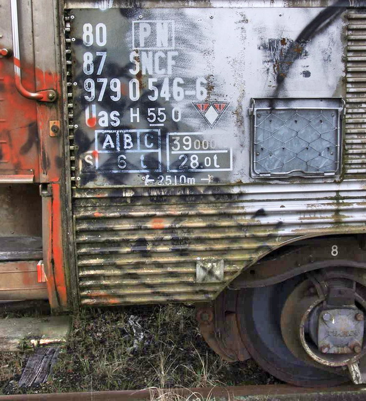 80 87 979 0 546-6 Uas H55 0 SNCF-PN - DEV Inox caisse longue de 25,094 sur des bogies Y20H du programme U55