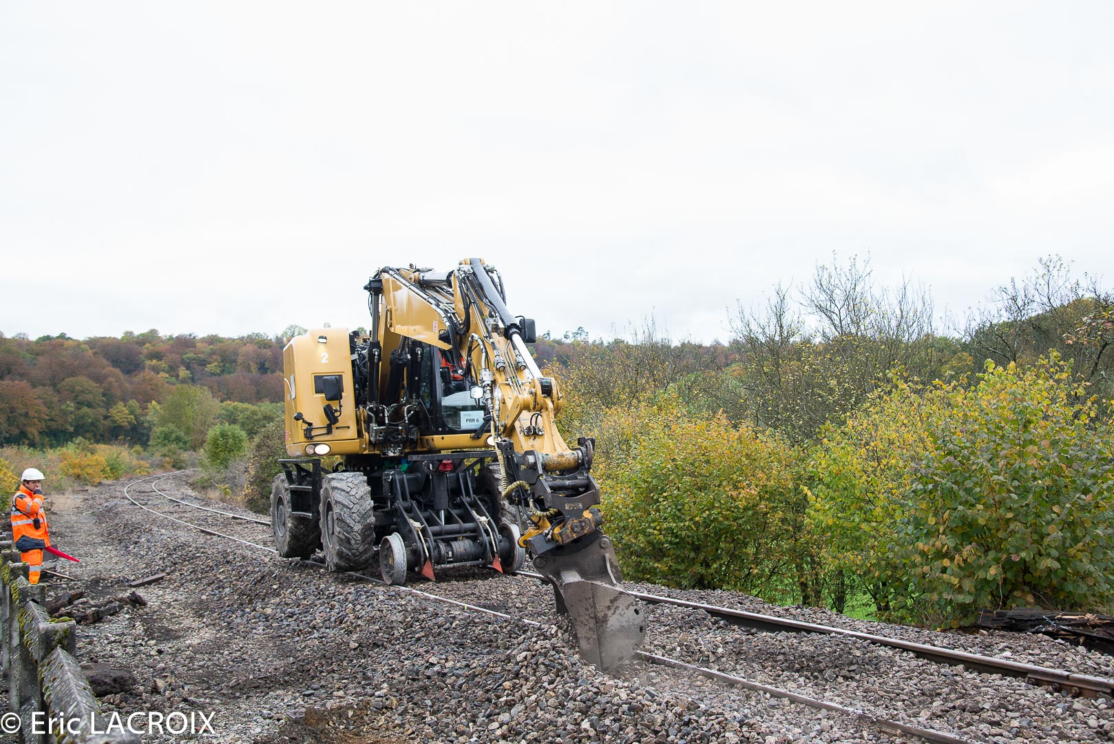 Aucun engin ferroviaire n’est nécessaire pour ce chantier, neuf pelleteuses rail-route œuvrent avec divers équipements.