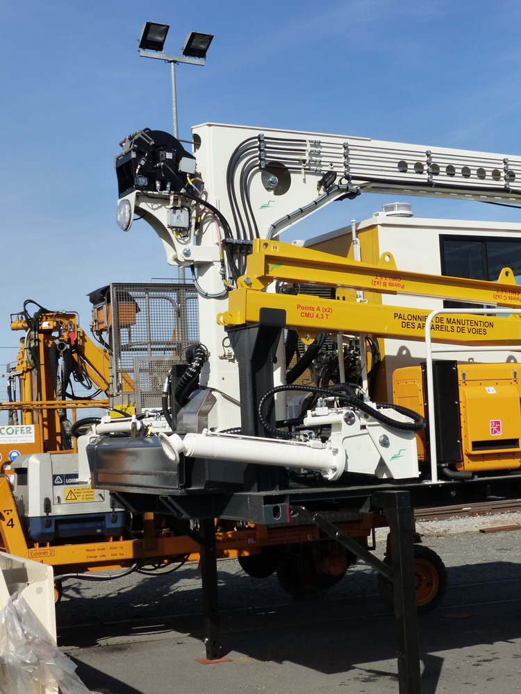 La grue portique a une capacité d'environ 30T/m une fois que les stabilisateurs sont sortis donc camion à l'arrêt. C'est un développement propre à Socofer optimisé pour l'utilisation sous caténaire et dans toute configuration de dévers. En effet, les grues d'origine routières ne fonctionnent correctement qu'à plat et leur cinématique est incompatible avec la caténaire, à un moment ou un autre les bras touchent la caténaire si on veut manipuler une charge au pied dufût de la grue.
