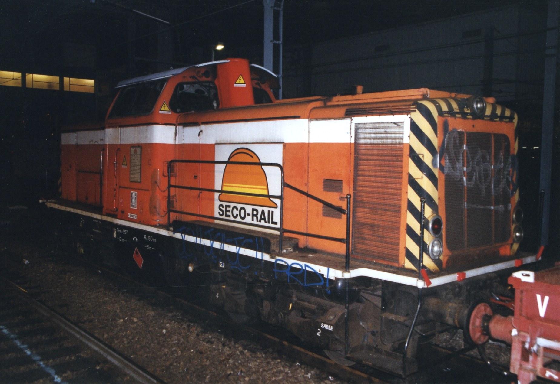Voici une V211 non identifiée de SECO-RAIL en gare de Massy-Palaiseau en Novembre 2003. Photos de nuit et assez mauvais mais peut-être interessant. Dommage que la machine est taguée.
