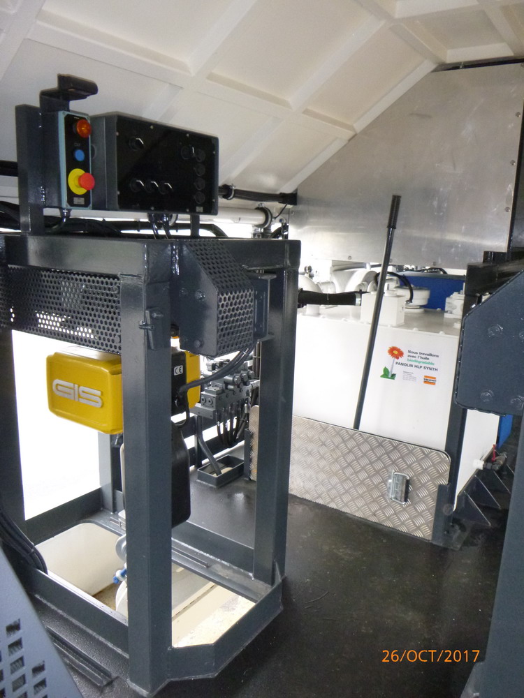 Nous pouvons voir les outils, l'énergie, les cabines, les sièges pour les ouvriers, l'extraction des gaz de soudure, le treuil pour manipuler les traverses et leurs points de stockage de part et autres du treuil. les trois treuils pour les coupons de rail (par fil de rail) six en tout.