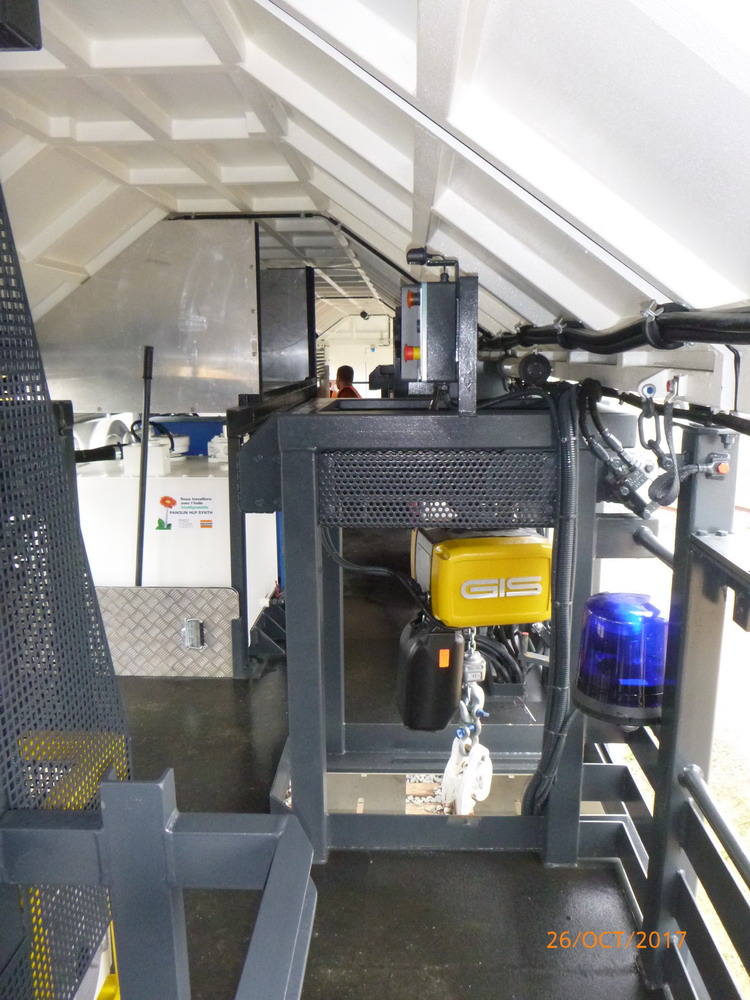 En dessous : la clipeuse, les supports des rails en position haute. La manche d'extraction de la fumée, il est très vitré sauf aux emplacement dédiés au travail: coupe soudure des rails