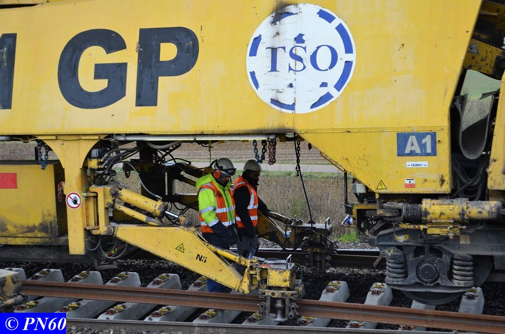 A la suite de ce train, des ouvriers vérifient l'écartement des rails et le dévers de la voie.