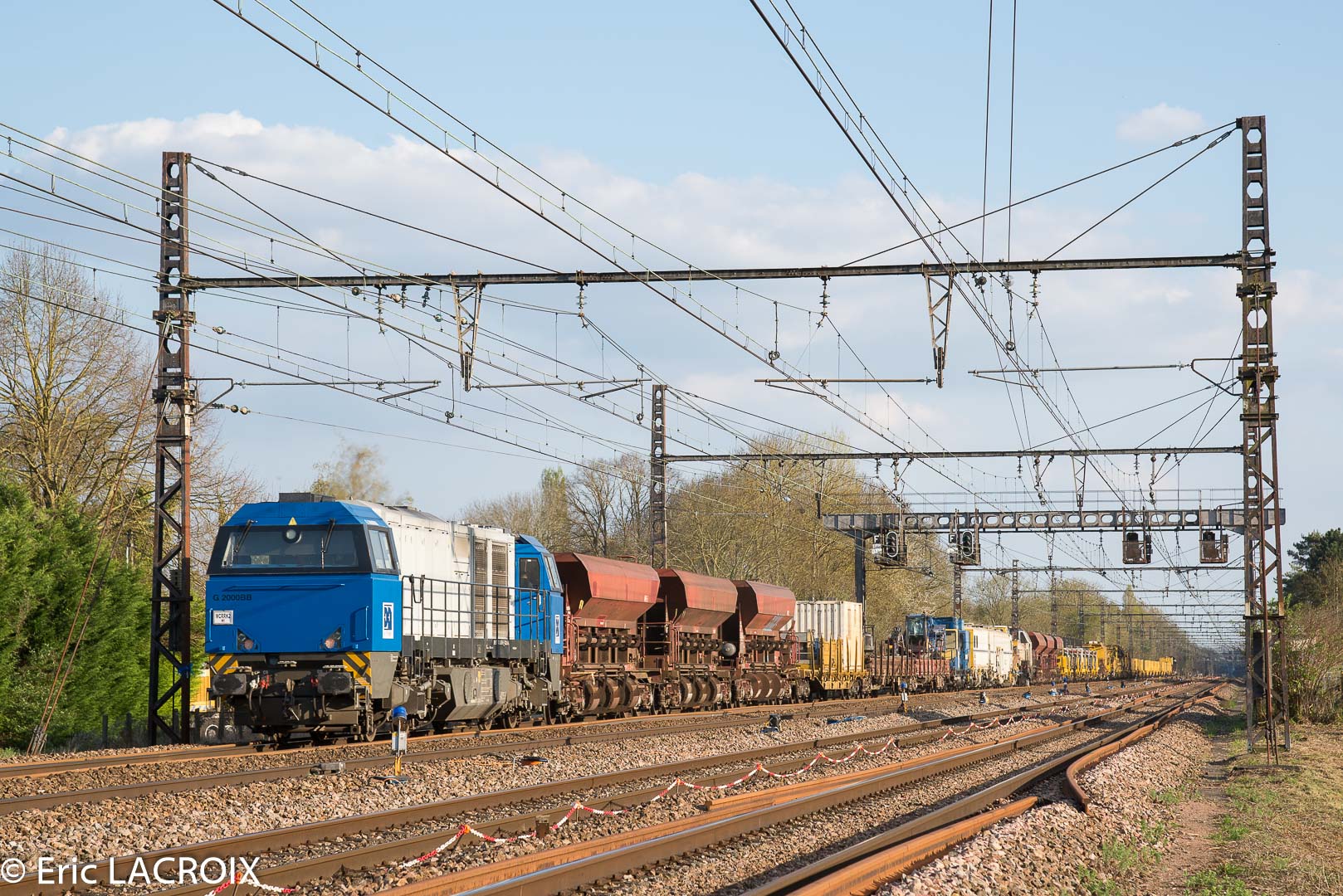 G 2000 BB 5001603 - 92 87 0 002 011-0 F - ETMF en tête du train de dégarnissage Matisa C-75 - 99 87 9 314 507-4 GCF Roma passe à Villeperrot (89) pour rejoindre la base de travaux de St Florentin. Avril 2017.