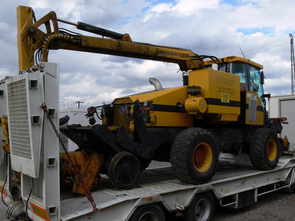 Voici une débrousailleuse rail-route UNAC 300RR, elle se trouve sur une remorque derrire un camion de la SNCF à Chateau-Thierry.