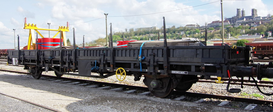 les trois wagons plats à bogies porte container ou bungalow en location sur la base de travaux de la gare de Laon le 13-04-2018