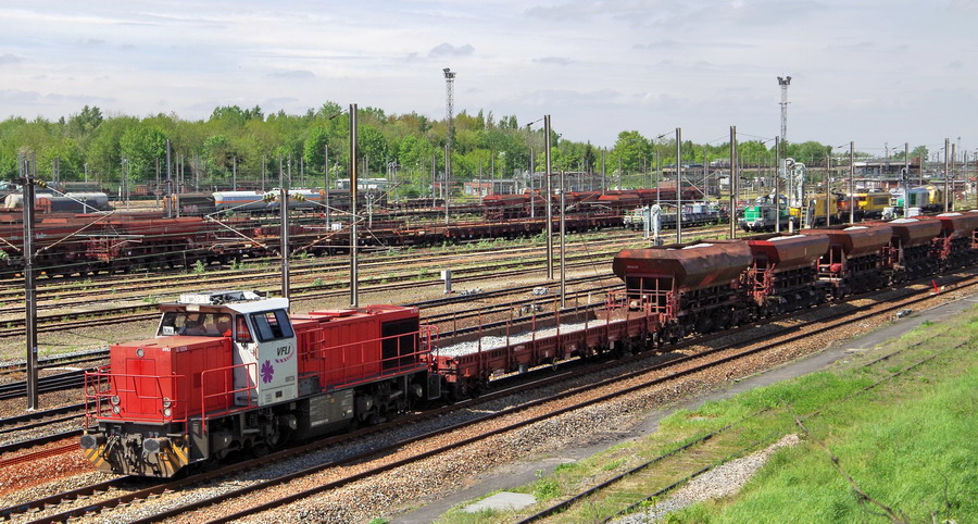 La voici sur la rame de TTX n°COC1 de 688m en gare de Chaulnes (80) pour la base de travaux Meccoli à Laon (02)