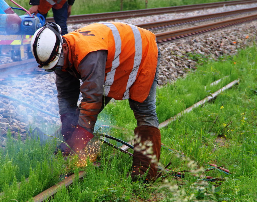 suite du reportage de Gtr Lefèvre entre la gare de Jussy et les ponts de Bray (02) pour une séance de coupage de coupon de rail de 18 m avec un chalumeau coupeur oxygène + acétylène par une équipe de Meccoli avec SNCF Réseau