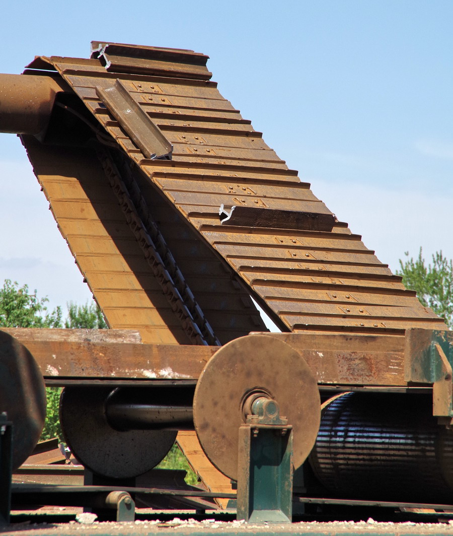 Six rails peuvent être alimentés simultanément à la tête du brise-roche par l'intermédiaire de la bande transporteuse du brise-roche à briser simultanément. Brisés en morceaux de 80 centimètres, les rails quittent le brise-roche. Le brise-roche est capable de briser 40 tonnes par heure. En outre, le brise-roche peut également manipuler des pièces de 40 cm. Un autre grand avantage du brise-roche est le déploiement rapide. Le concasseur arrive chez le client, tamponne au sol, plie la courroie d'alimentation et de déchargement et peut immédiatement commencer à traiter les rails.