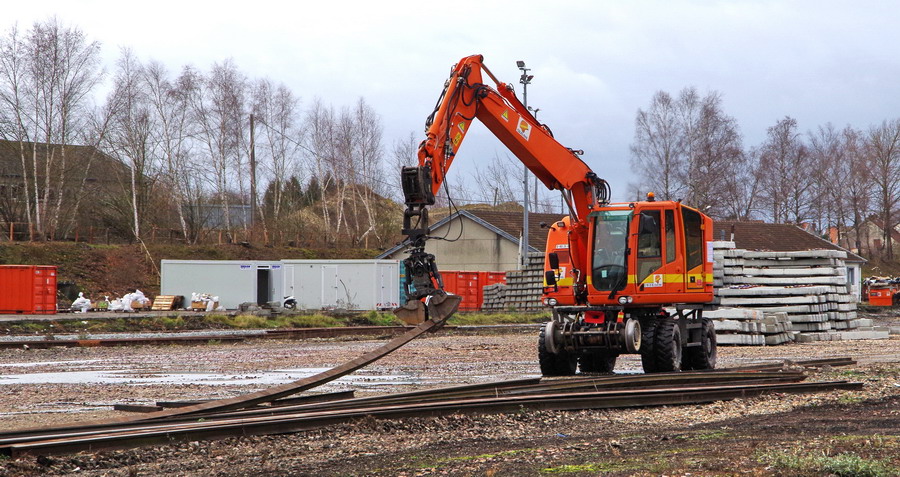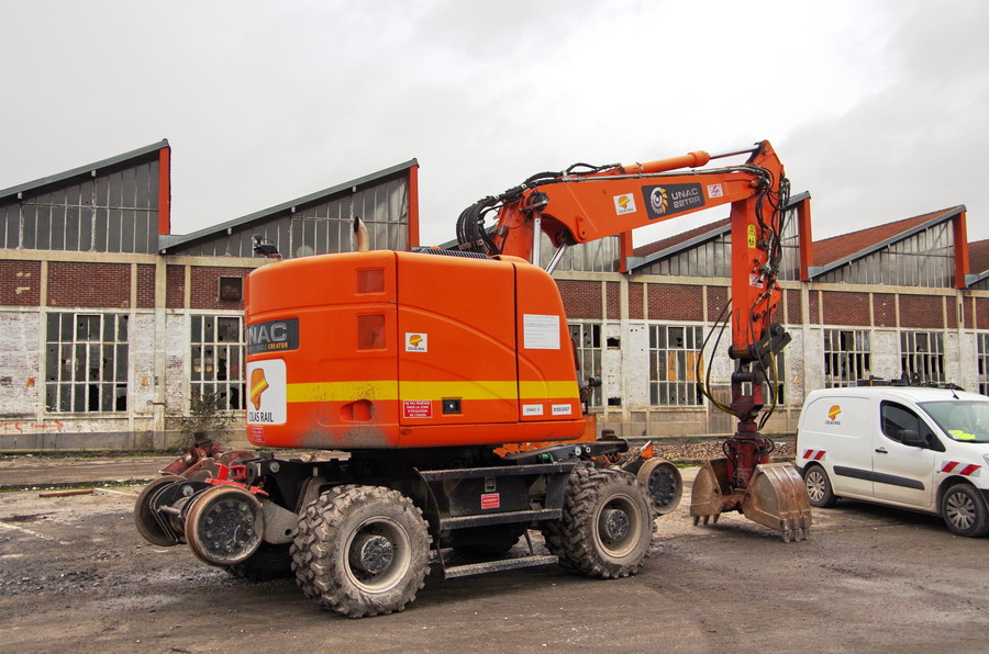 Pelle Rail route Unac 22 TRR n°CATM15DAJ5B00350 Colas Rail sur la base de travaux arrière à Longueau le 07-12-2018