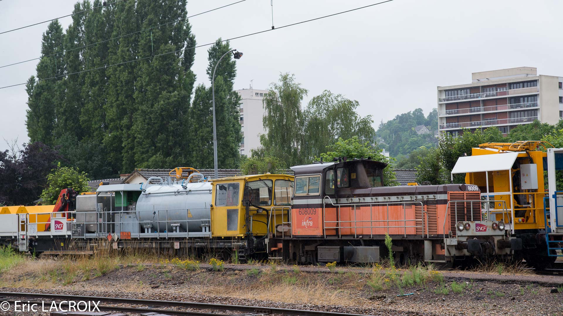 Vers 11h00 arrivée sur voie B d'un train Infra suite Caténaires encadré par la BB 64609 et le Y 8009.