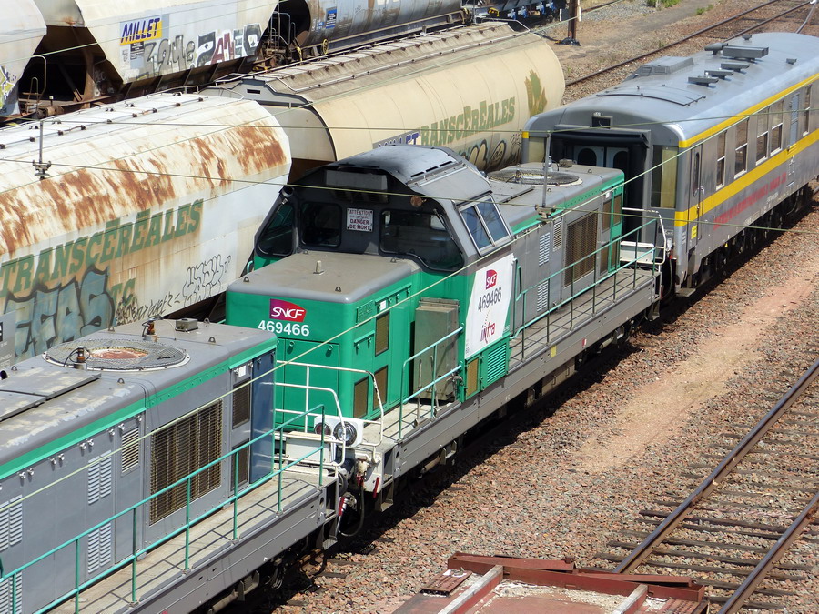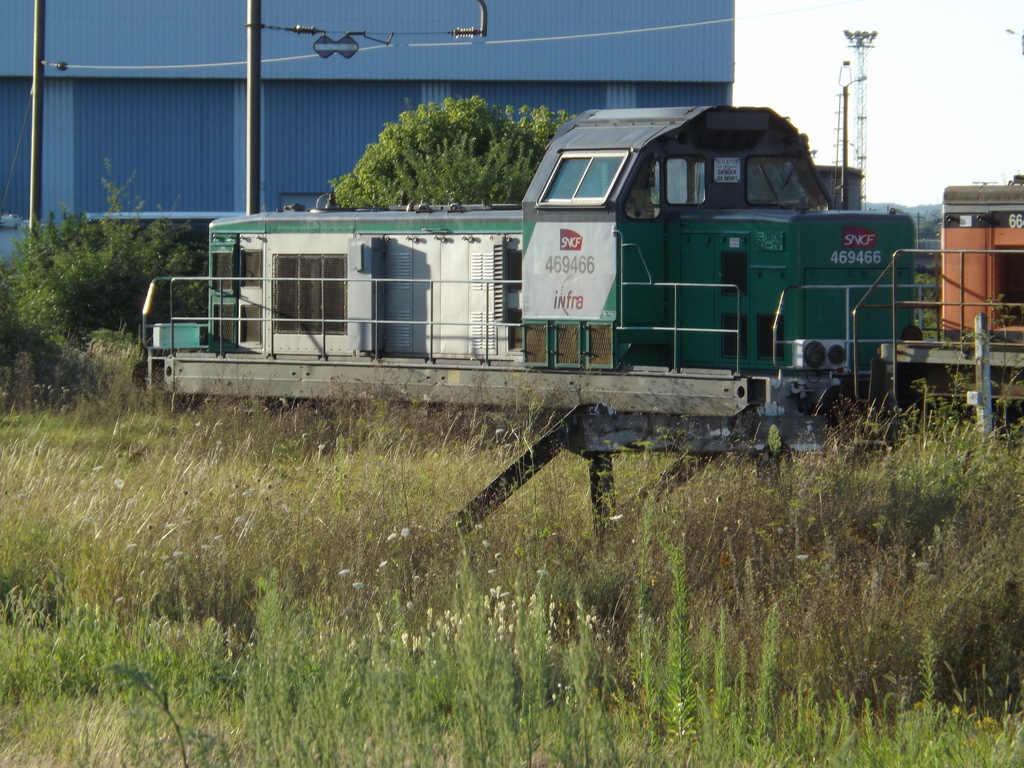 Voici la 469466 (ex 66466) Infra avec le logo en livrée Fret en queue sur un TM de trois machines pour le dépôt