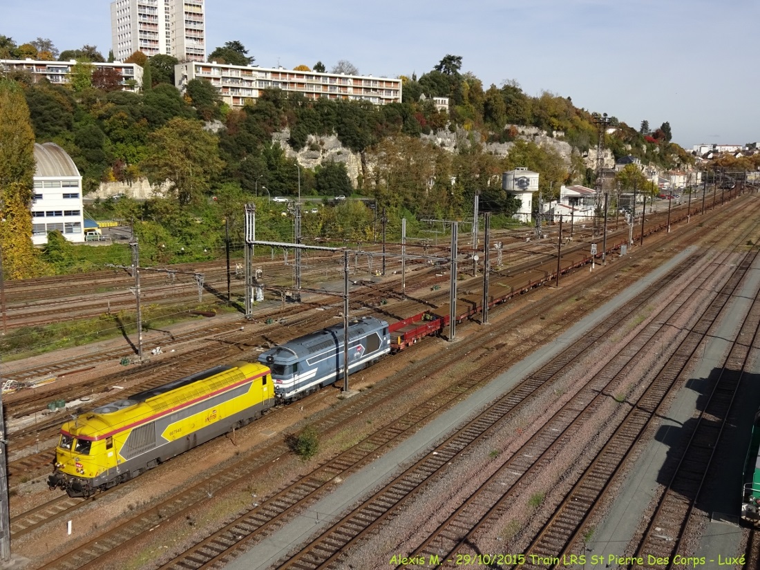 Bonsoir, la 67548 en tête de ce train de LRS St Pierre Des Corps - Luxé, à Poitiers, avec la 67499 en seconde position, le 29/10/2015: