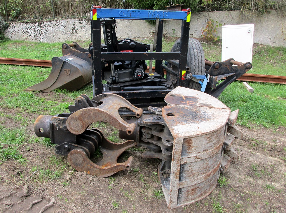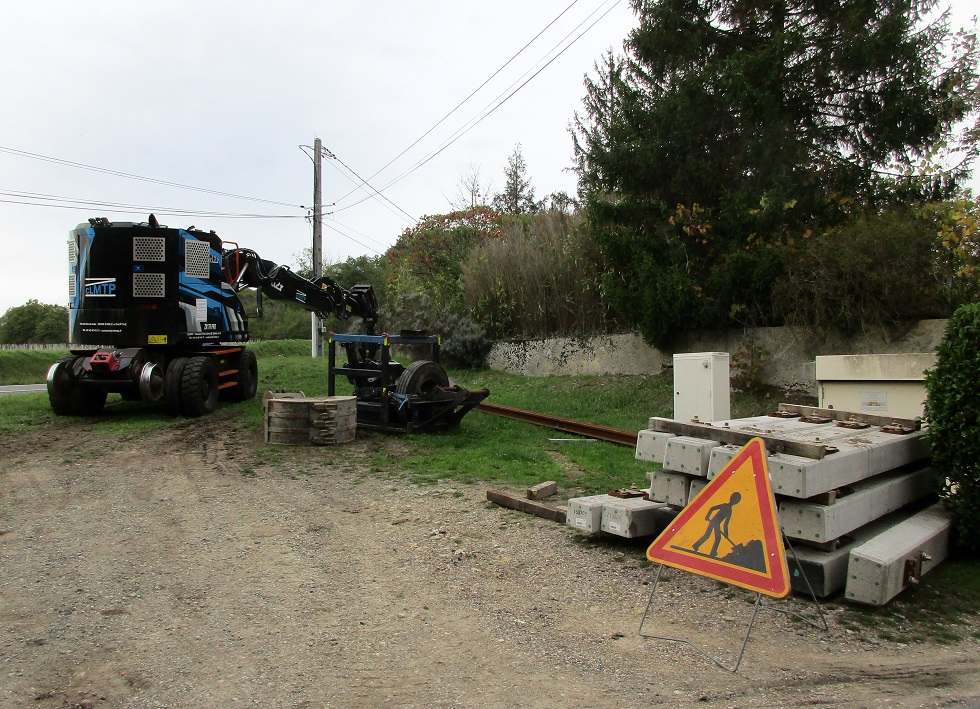 Au lieu-dit Cornillé sur la commune de Chambourg sur Indre (37 - Indre et Loire), des travaux de réfection sont en cours au PN 77 (PK 279,699 ligne Tours Loches). Une équipe SNCF travaille conjointement avec du personnel de l'entreprise CLMTP (CLAISSE Location Matériel Travaux Publics basée à Solesmes près de Sablé sur Sarthe dans le 72 - Sarthe). Une PRR "d2r ZX 170-6" est sur place pour déposer le vieux ballast, les traverses bois et les coupons de rails DC de part et d'autre du PN avant le remplacement par du ballast neuf, des traverses bétons et du rail UIC :