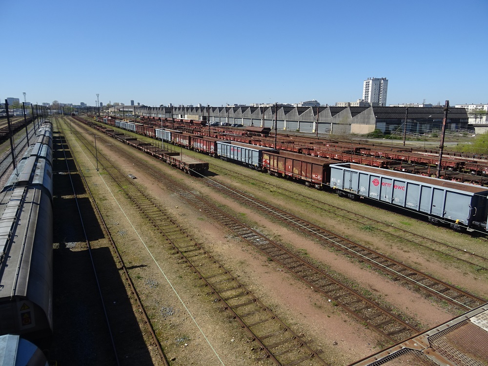 SNCF RESEAU commence a utiliser des wagons tomberaux de location du parc Ermewa de type Eanos , ici les wagons gris . St Pierre des Corps avril 2023.