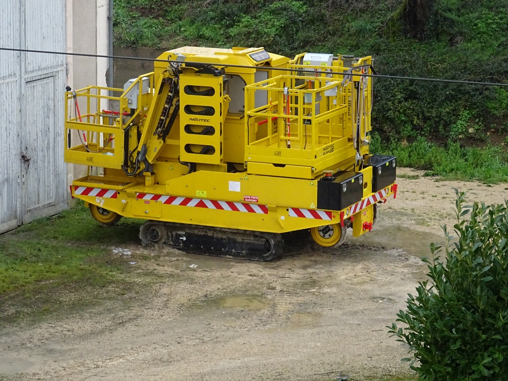 Nacelle de chez Cat Rent, on aperçoit le logo "microscopique" sur la nacelle et la plateforme ciseau.