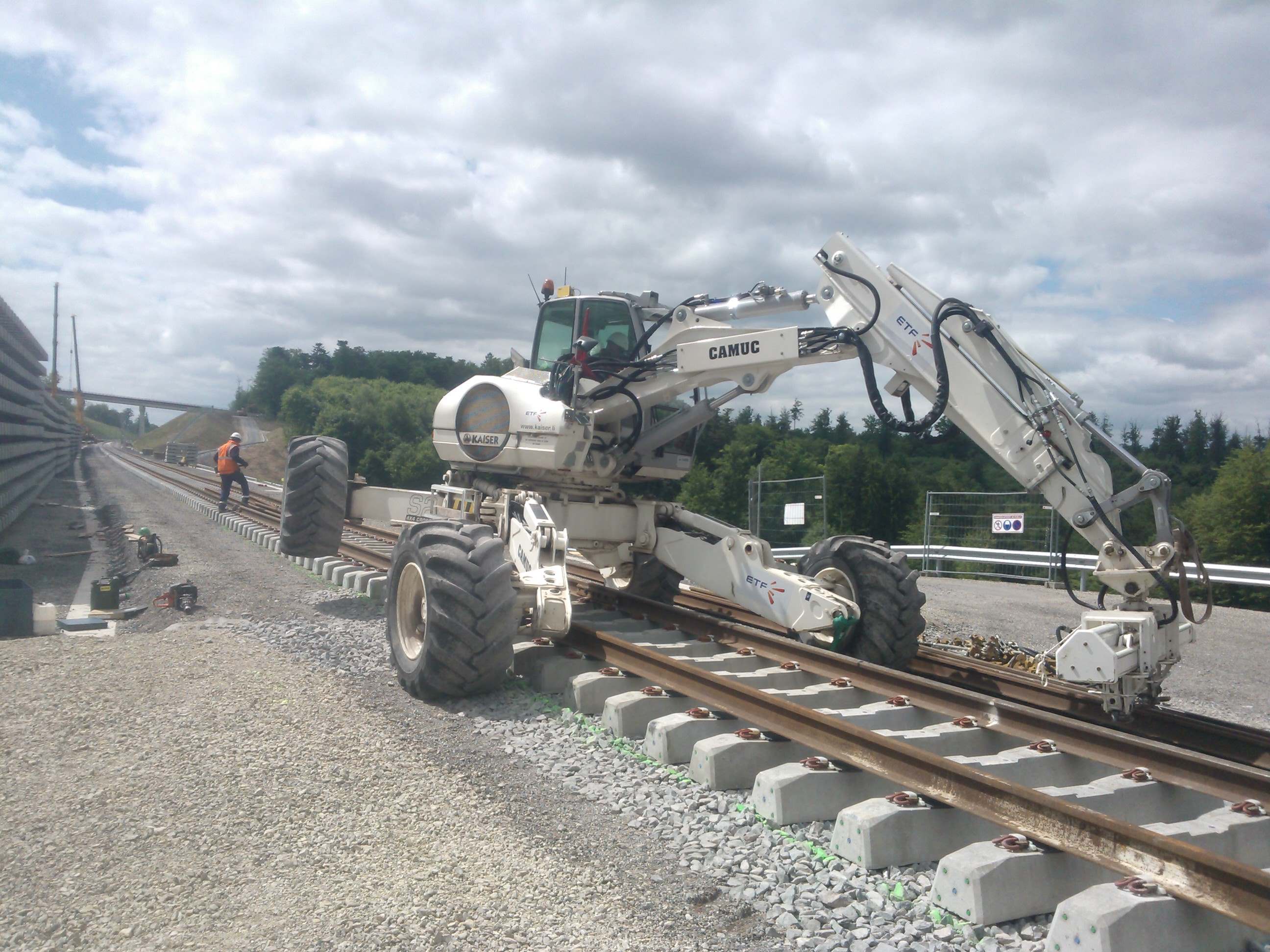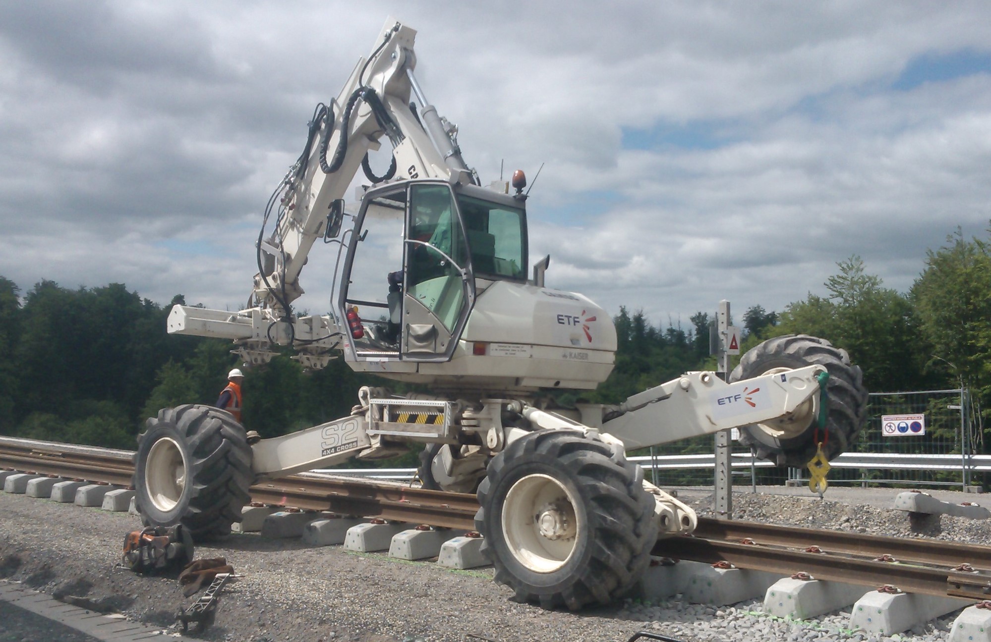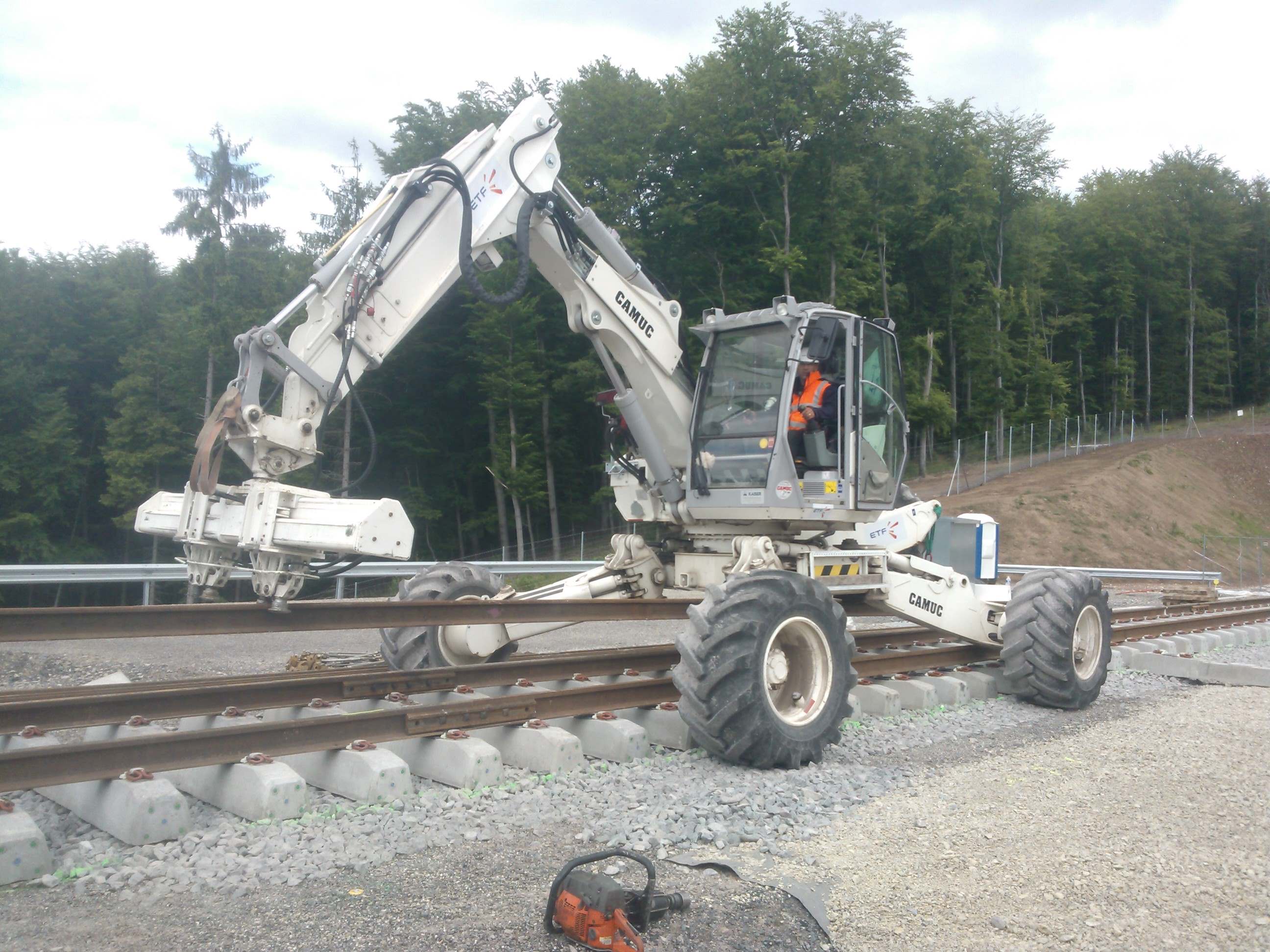 Nouvel engin arrivé sur les chantiers LGV: permet de rouler littéralement au dessus de la voie...et nécessite des nerfs de pelleur d'acier et une (très) bonne coordination des 5 membres...