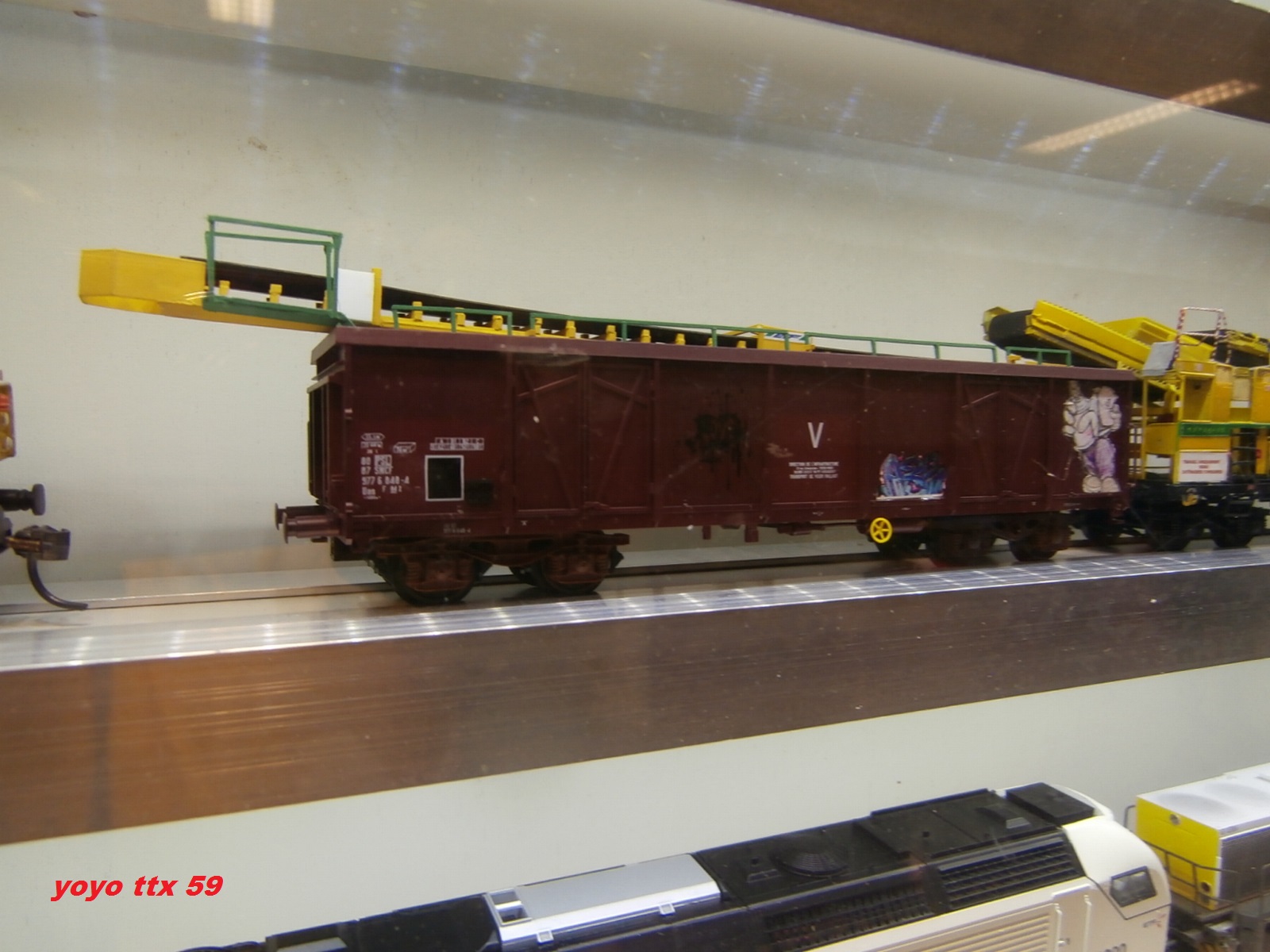 Voici un tombereau équiper de cette bande transporteuse a l'échelle HO pendant l'expo du VALDAHON 2019 :